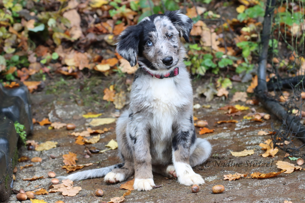 Ranger ist ein Miniature Australian Shepherd in einem sehr dunklen red ( tri ) der Weißsanteil ist nur sehr minimal und genau das macht ihn wirklich besonders .
